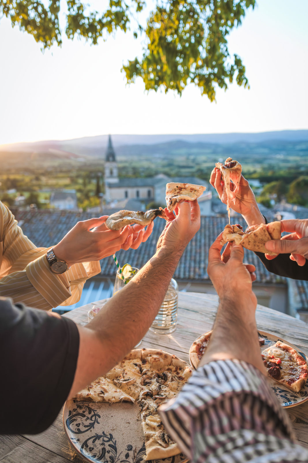 À déguster sur nos terrasses ou à emporter, nos pizzas séduisent aussi bien les familles que les visiteurs de passage, les randonneurs, les cyclistes ou les amoureux du Luberon.